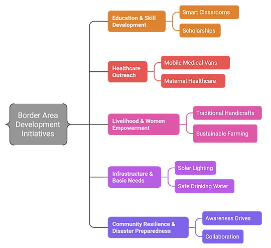 - Scholarships for border-area children and skill training programs for local youth.